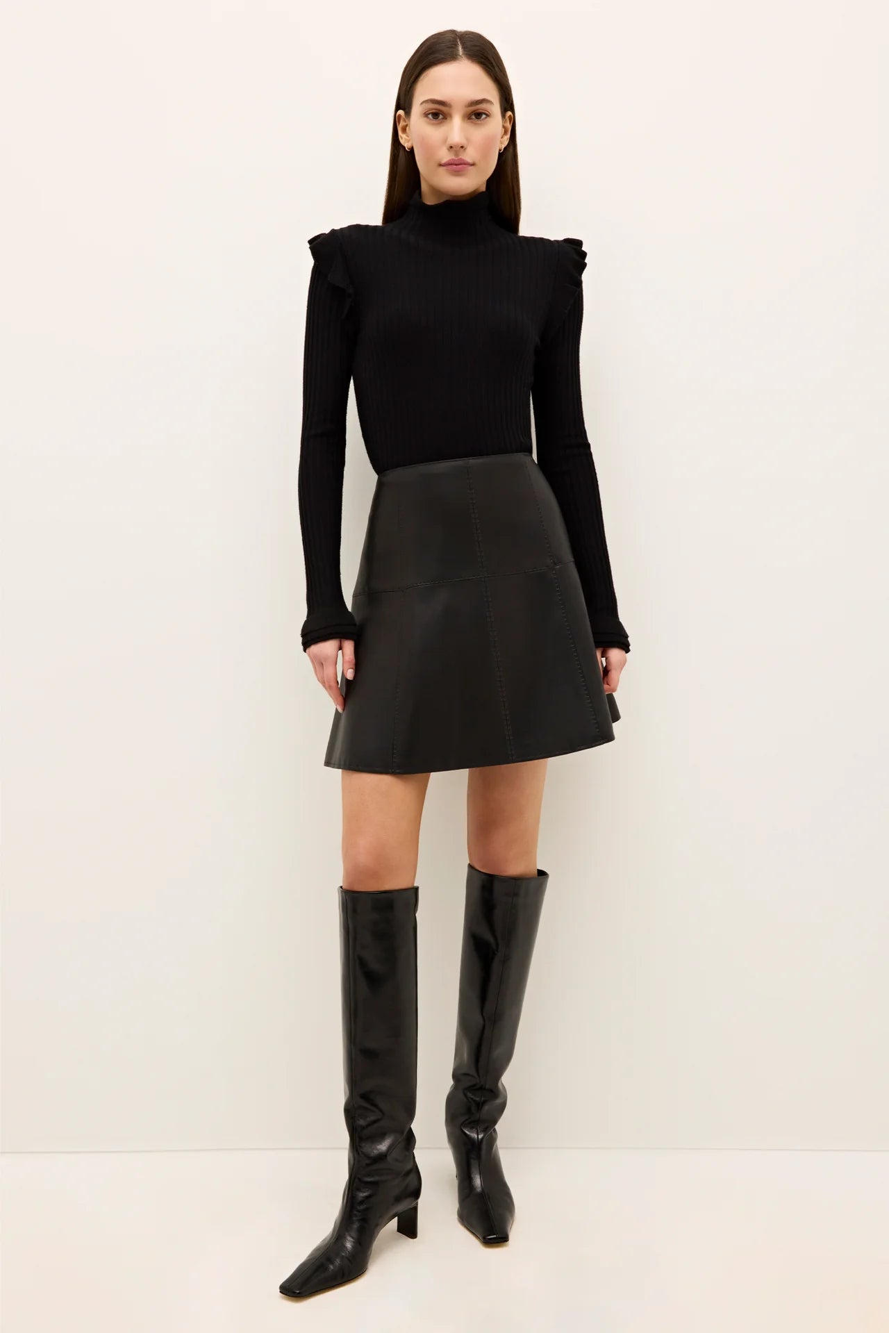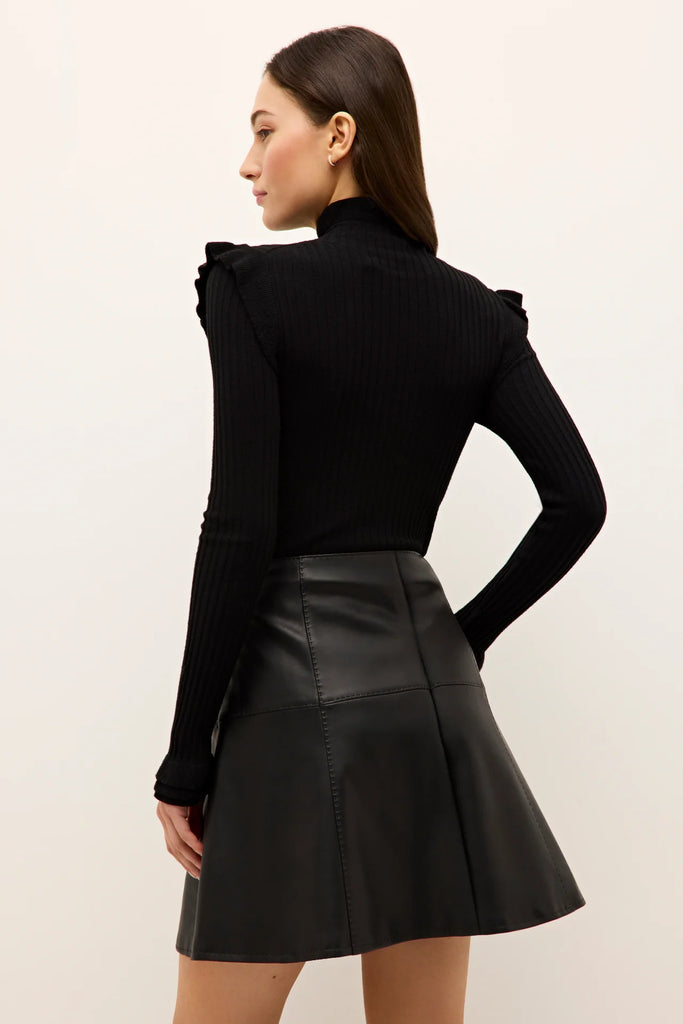 This versatile mini is fitted at the waist and hips with a gentle flare to create a flattering and playful silhouette. Cut from our new and improved soft vegan leather, the Crawford skirt is pictured here with our best-selling Tinley turtleneck for a classic and elevated autumn look.