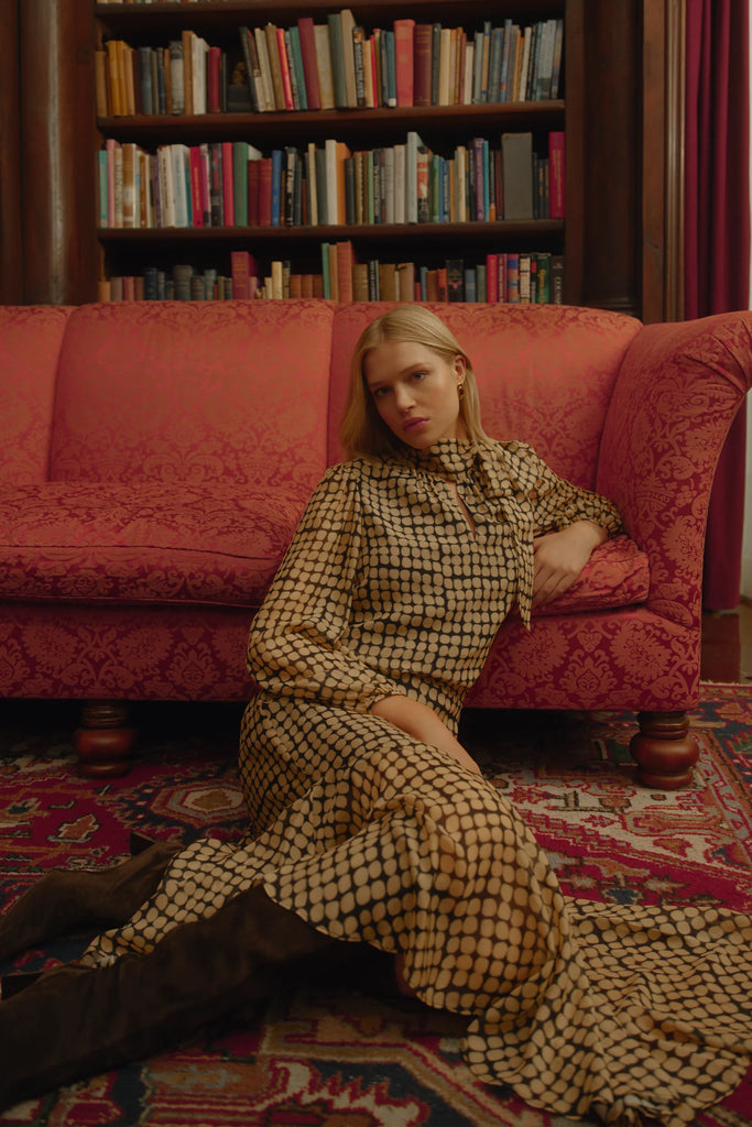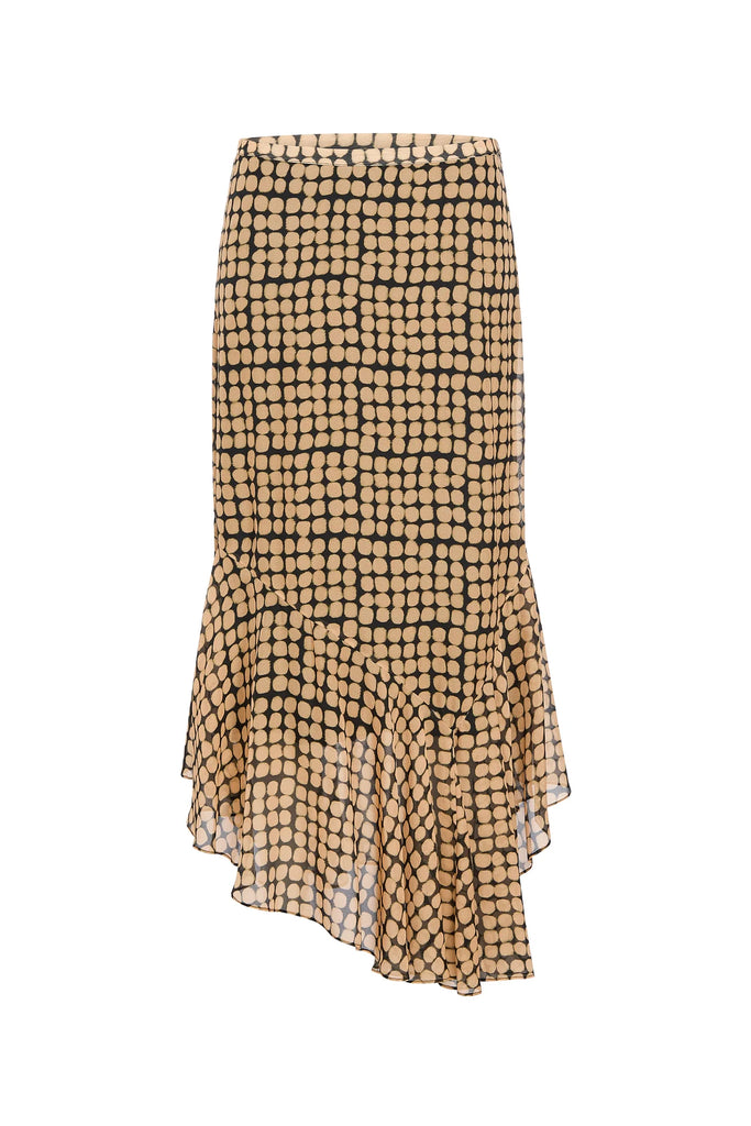 This printed midi skirt with feminine design details like the asymmetrical ruffle at the hem is classic Marie Oliver complete with a scene-stealing pattern. Because while Krista is striking on her own, the silhouette wins a permanent place in our holiday party wardrobe rotation courtesy of our Dapple print, a glimmering, black-and-gold dot motif that recalls the twinkle of Christmas lights through a darkened living room window. Style with the matching Vivianne top for a matching set that stuns.