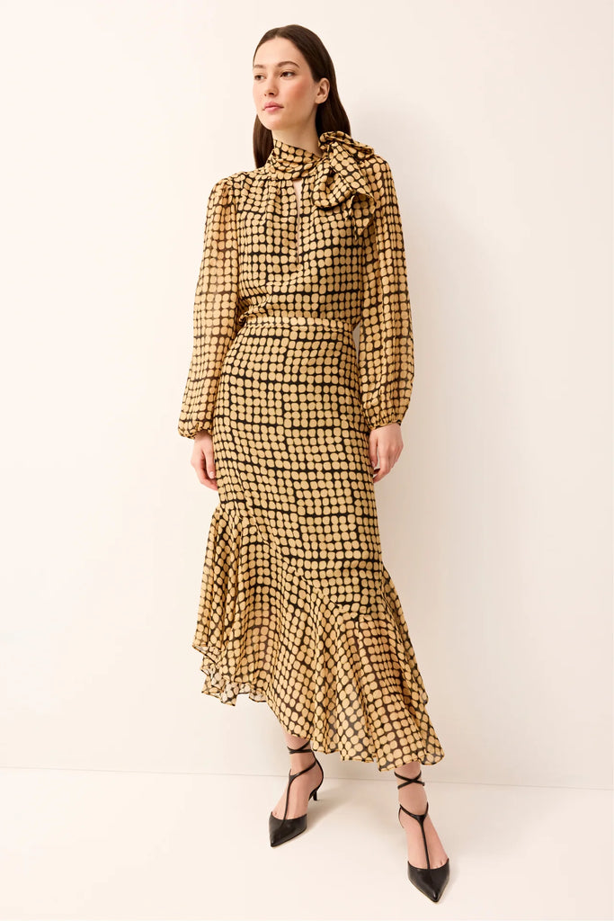 A modern take on the classic pussy-bow blouse, Vivianne stands out with a plunging keyhole neckline and the subtle metallic sheen of airy silk chiffon. Its black-and-gold dot motif evokes raindrops glistening in the evening light, or the soft glow of twinkle lights through a window on a winter night. For a head-to-toe effect, style with the matching skirt