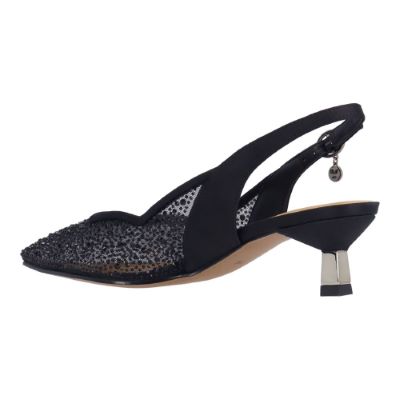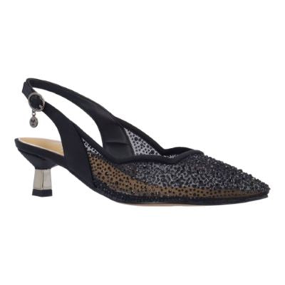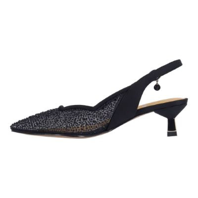 This mesh/fabric/rhinestones pump has a pointy toe, memory foam+latex insole, synthetic lining and synthetic outsole. This style also features a buckle closure on a 2 inch heel.