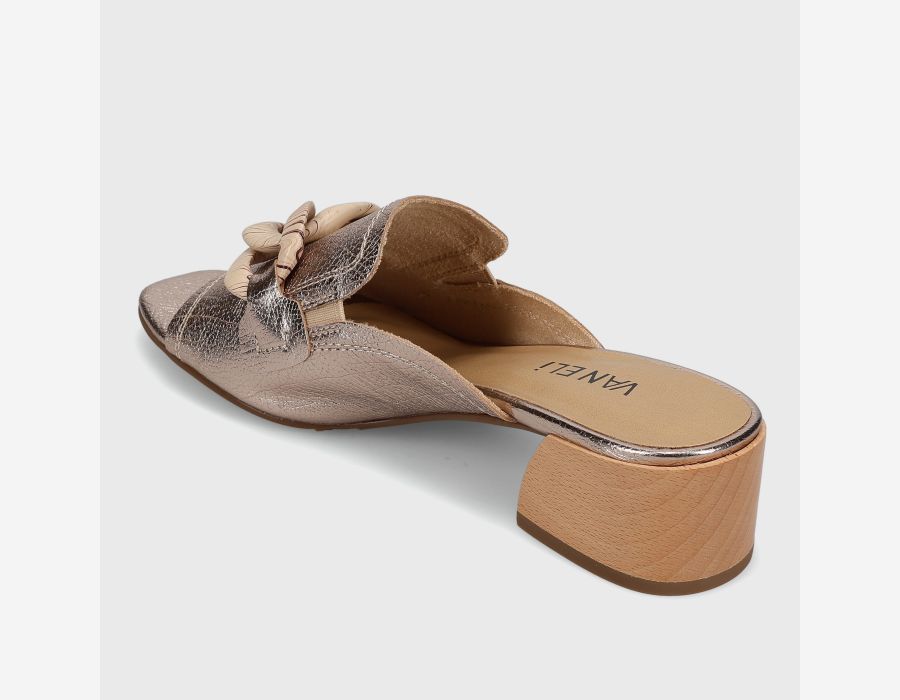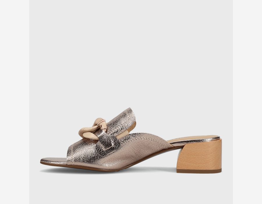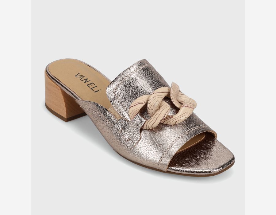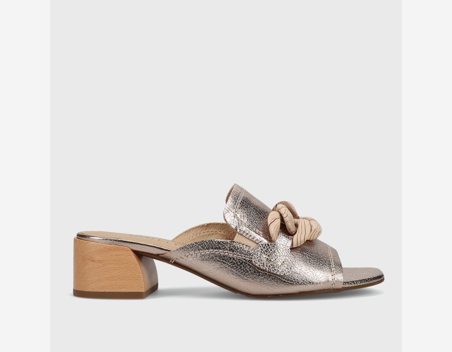 Open-toe leather mule. Loafer topline. Resin chain accent. Elastic gusset insert. Padded insole. 1.5 inch sculpted wood heel.