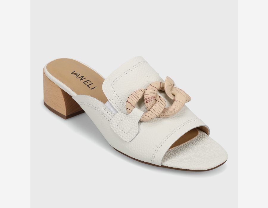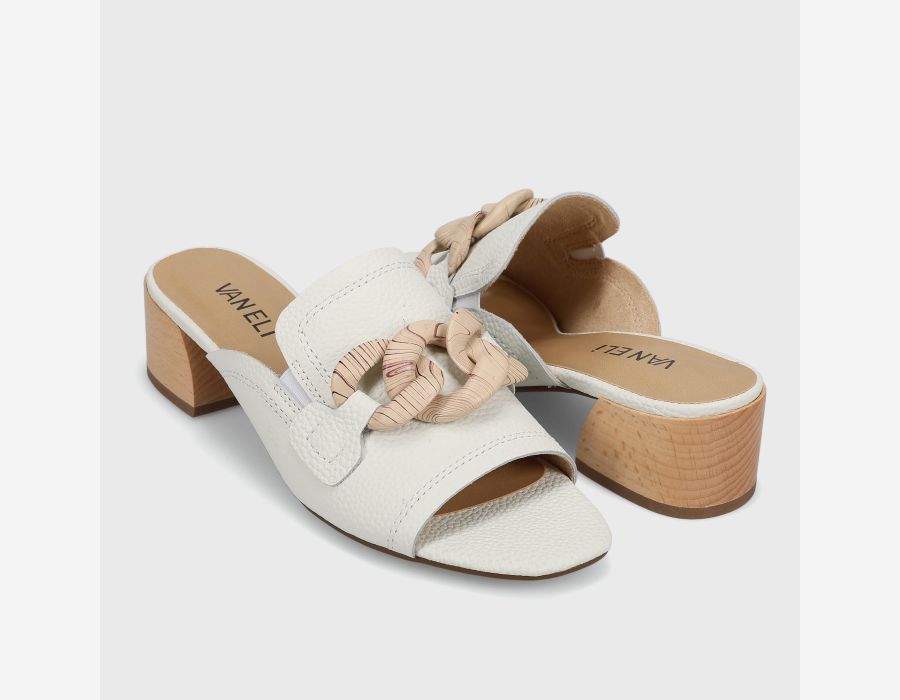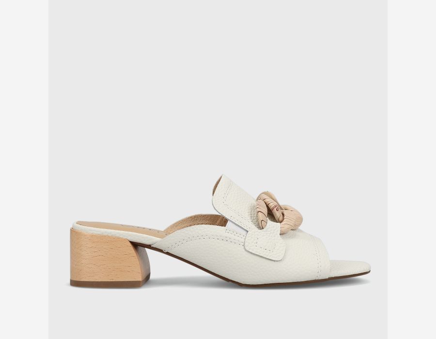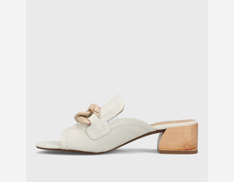 Open-toe leather mule. Loafer topline. Resin chain accent. Elastic gusset insert. Padded insole. 1.5 inch sculpted wood heel.