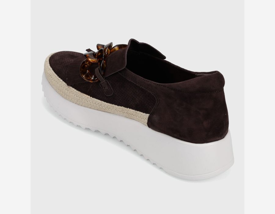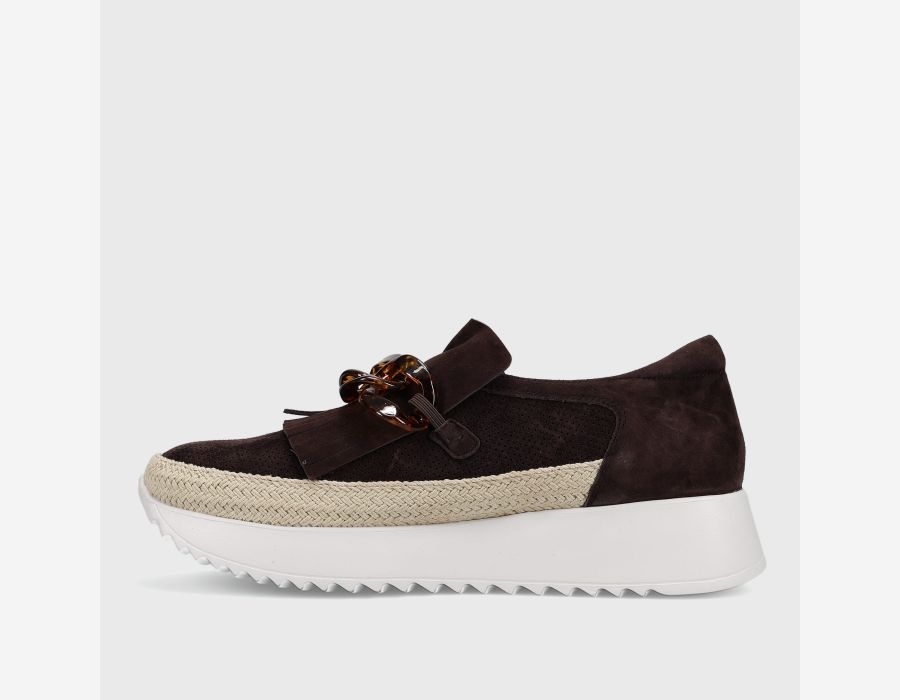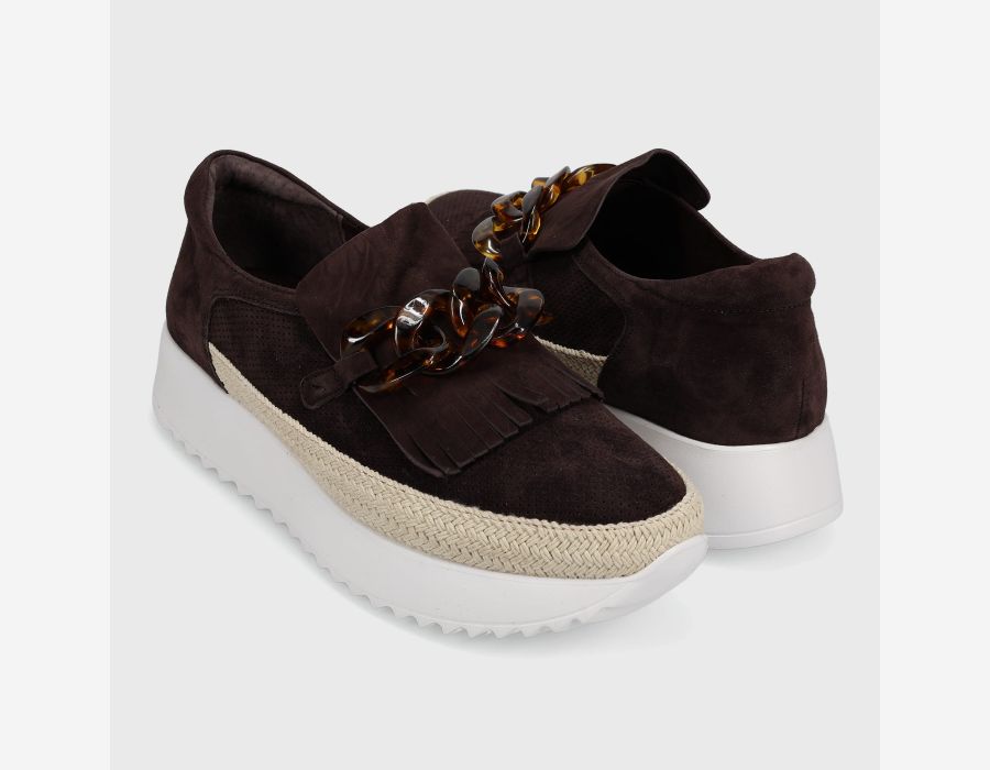 Kiltie athleisure shoe. Resin chain accent. Perforated suede upper. Braided trim. Ultra-padded removable insole. 1.5 inch treaded rubber sole.