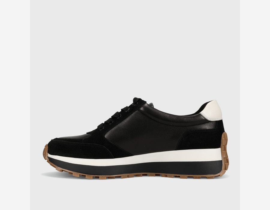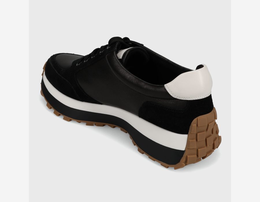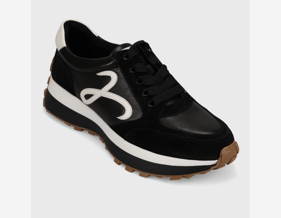 Leather lace-up fashion sneaker. Two-tone design. Ultra-padded removable insole. Treaded rubber outsole.