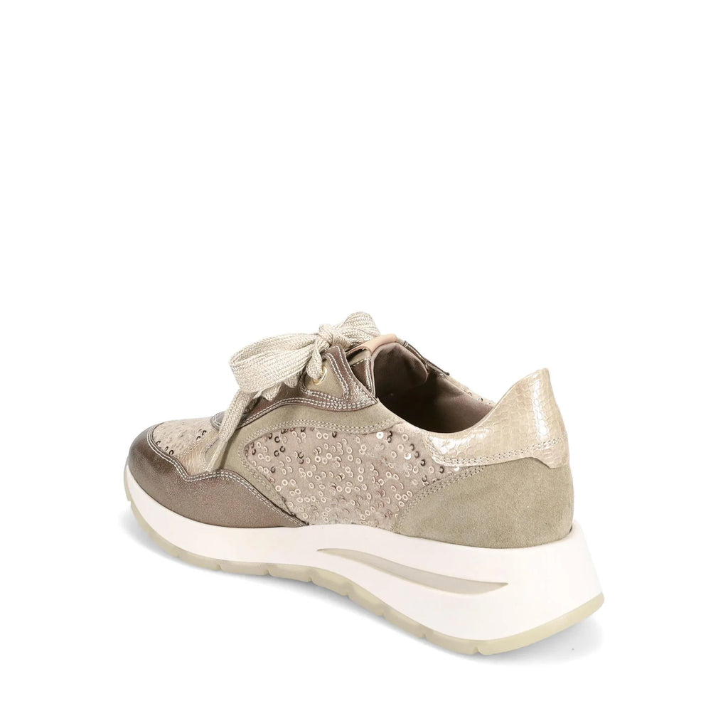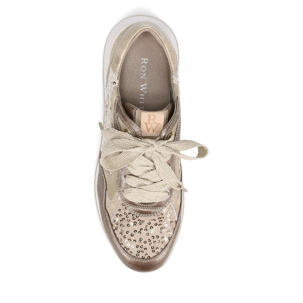 Zara in Metallic Calf with Sequined Velvet. Knit Laces. Featuring a Full Removable Footbed with Arch Support and Metatarsal Cushion. Anti-Slip Rubber Sole. Weatherproof. Made in Italy.