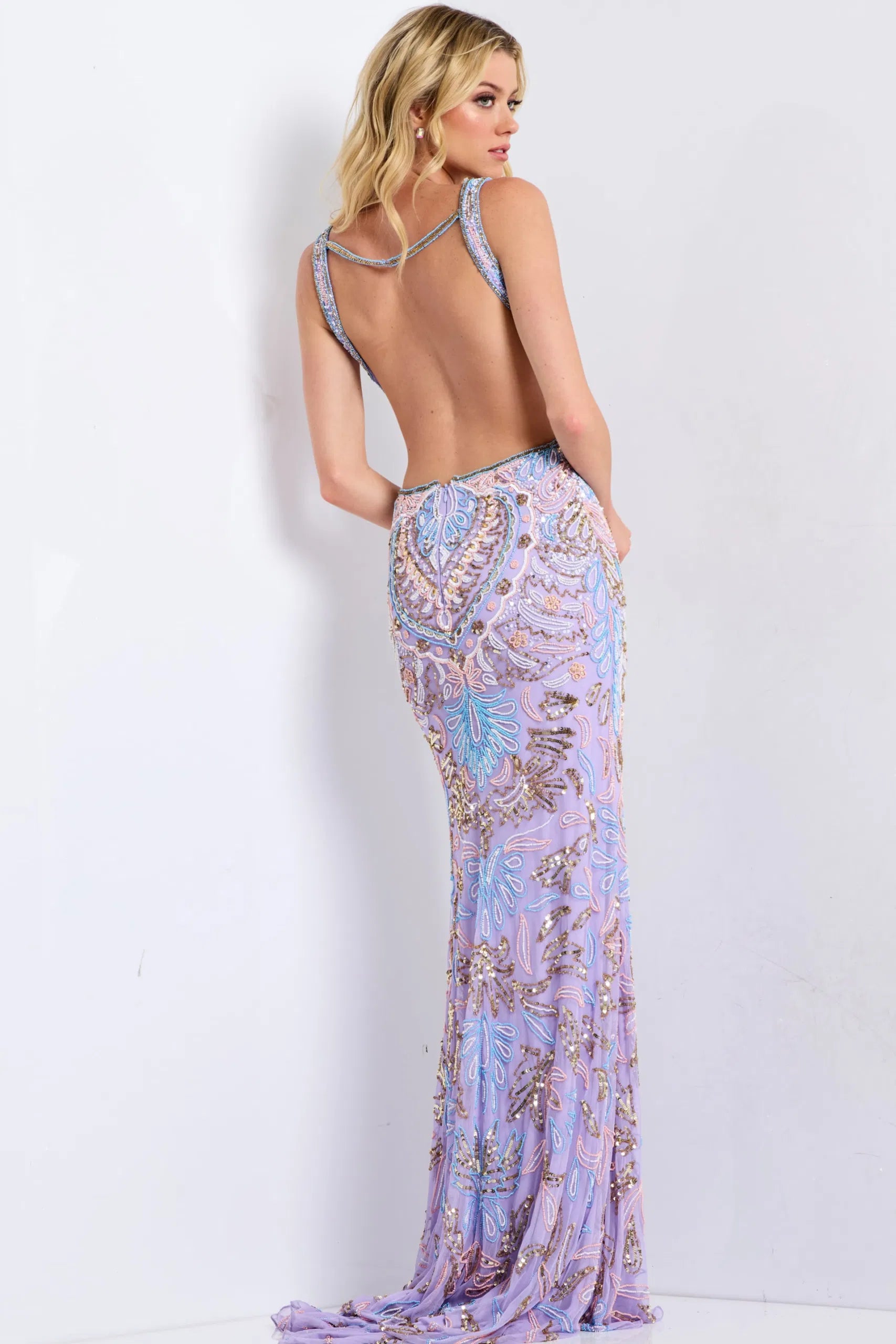 Plunging V-Neck Gown with Intricate Embroidery and High Slit 45533