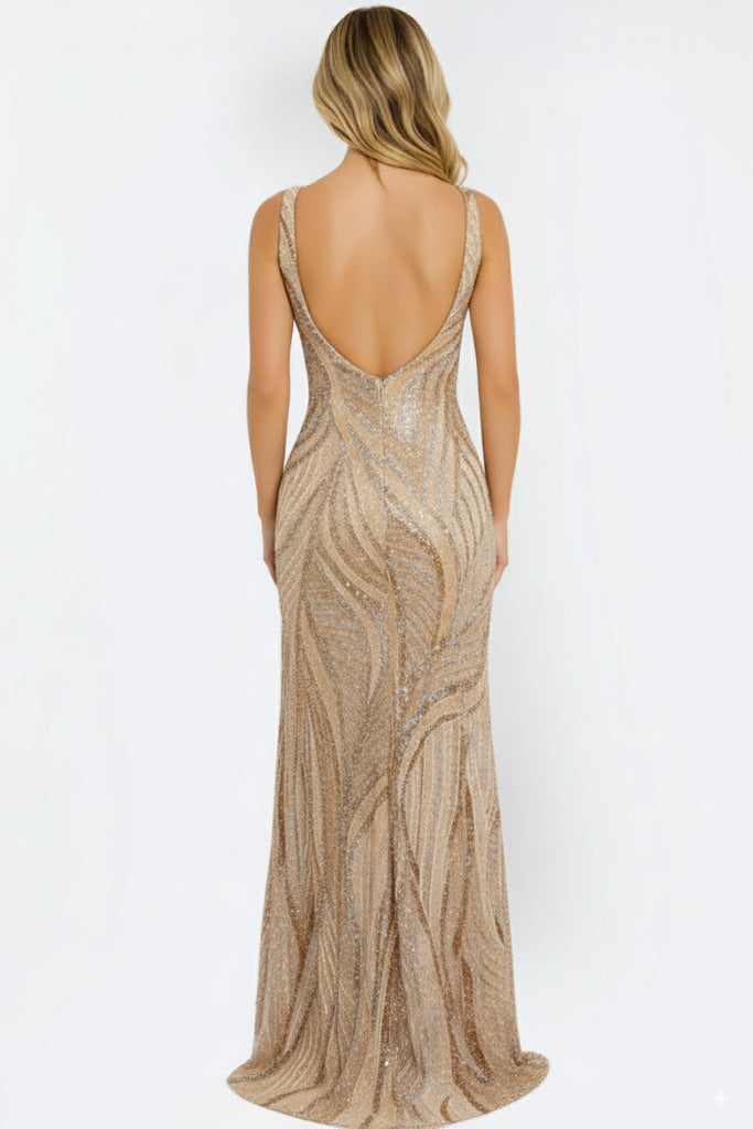 Sequin V Neck Gown with Illusion Bodice 42512