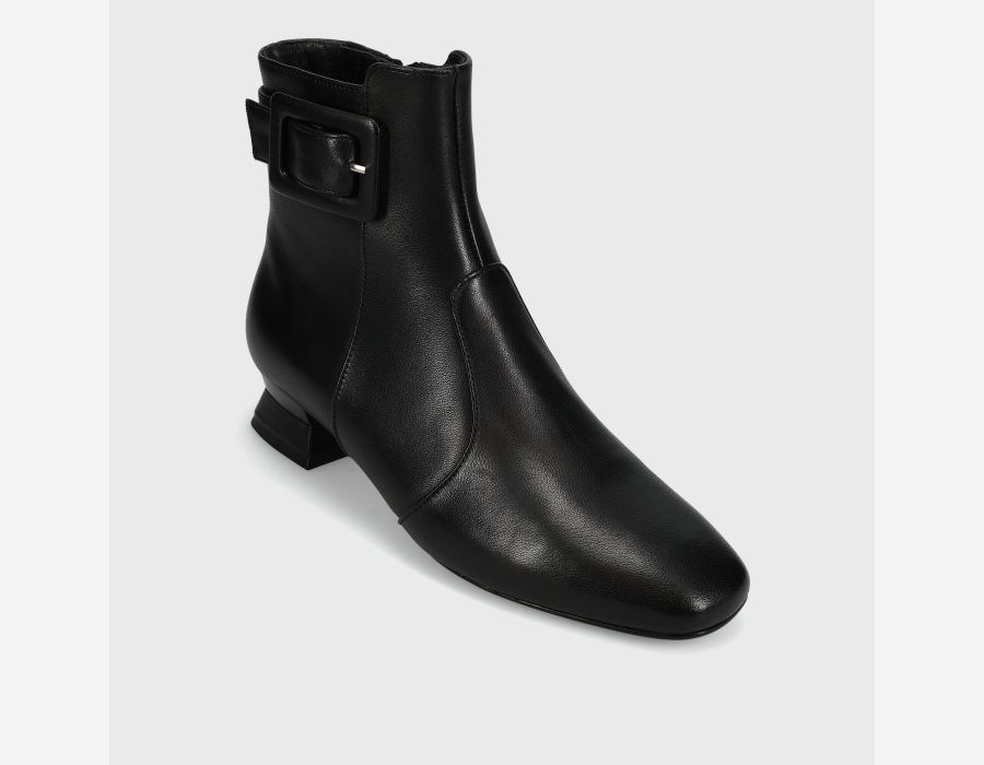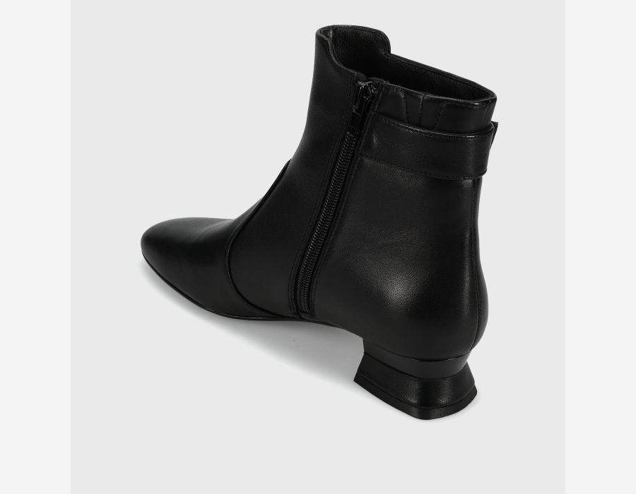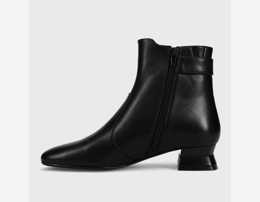 Rounded square-toe ankle boot. Side zip. Attached tab with matching buckle. 1.25 inch covered mixed material heel.