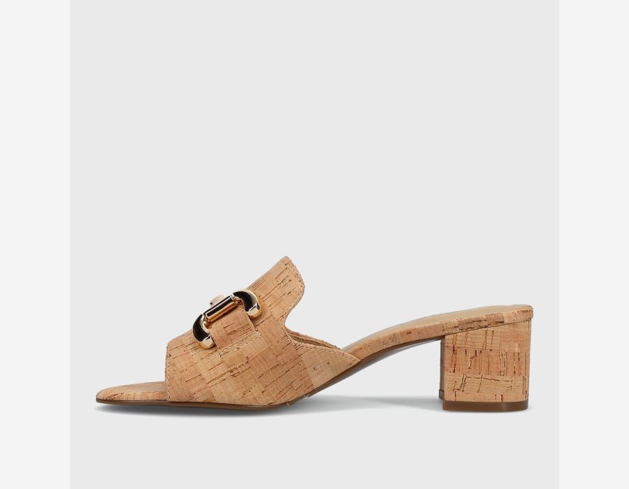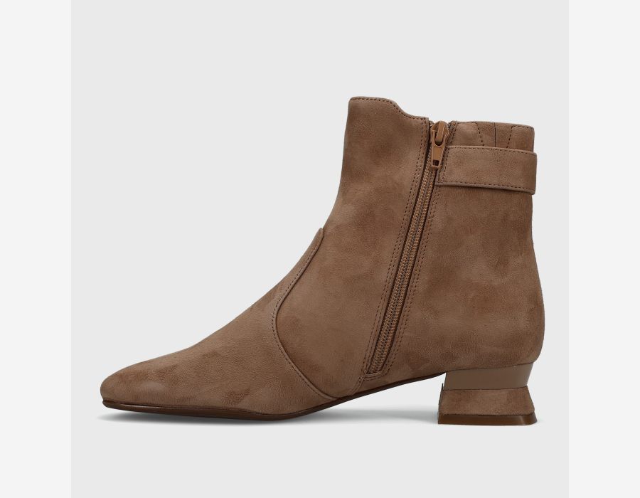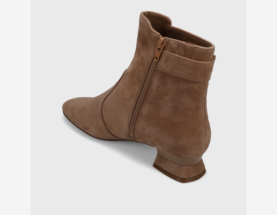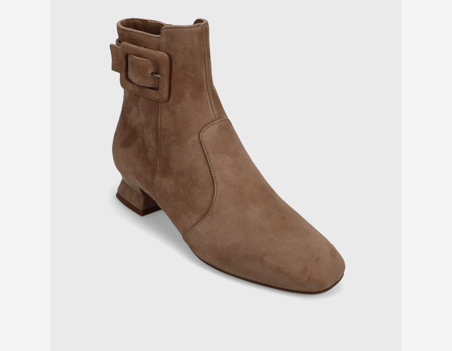 Rounded square-toe ankle boot. Side zip. Attached tab with matching buckle. 1.25 inch covered mixed material heel.