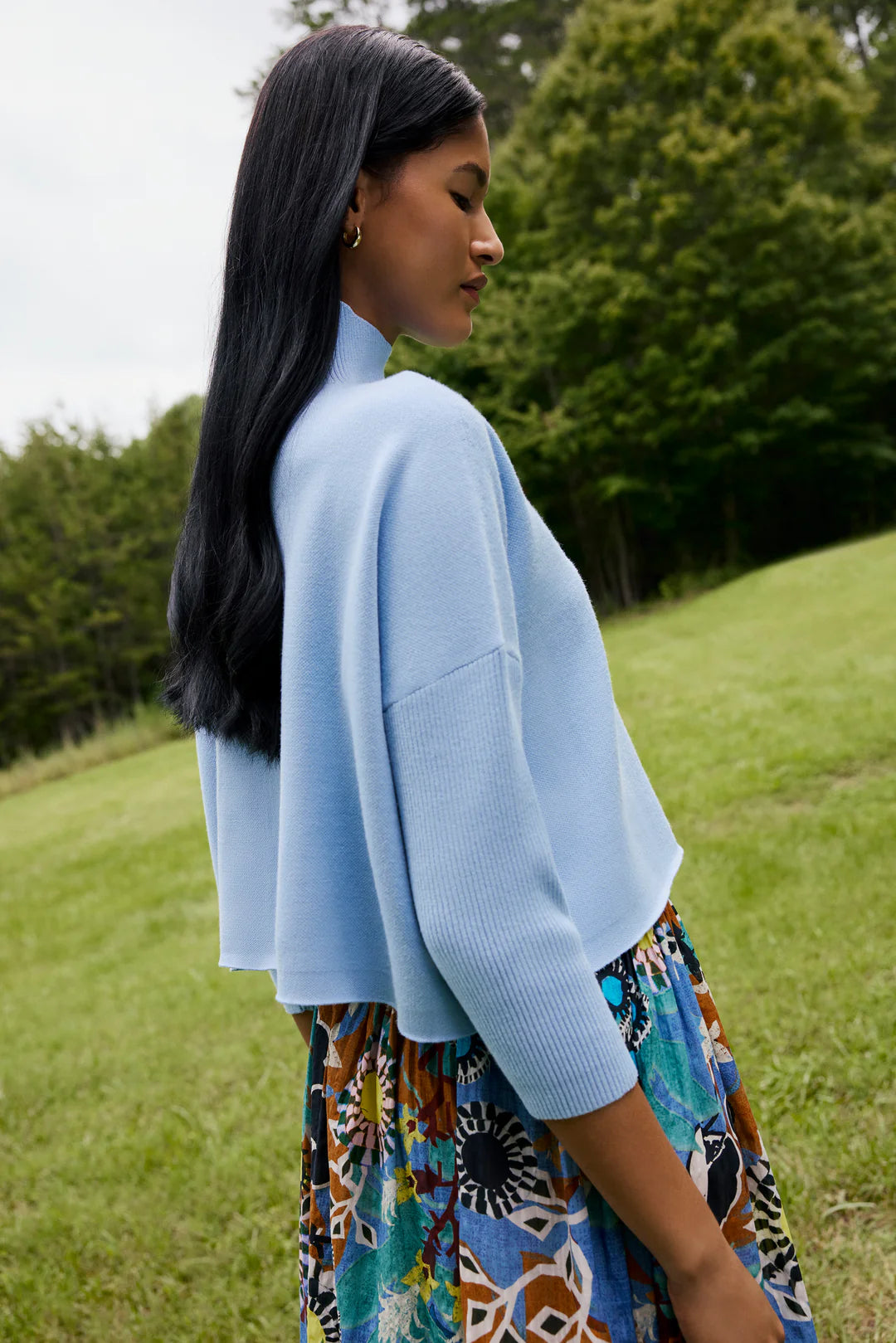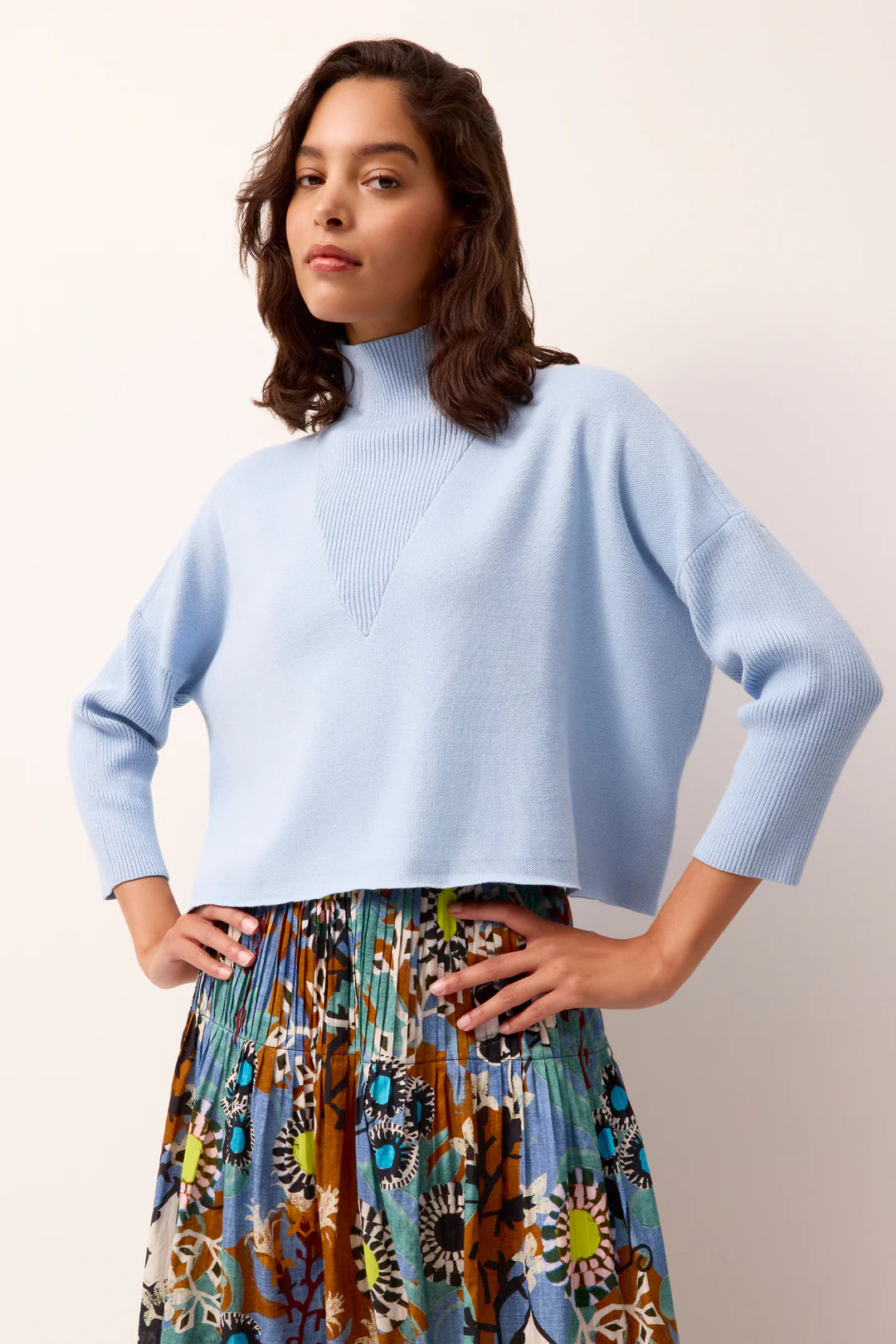 The definition of "effortless," our Claudie popovers pair beautifully with your favorite denim, and extend the wearability of dresses and skirts well into fall and winter. The cropped body features a boxy fit with three-quarter-length batwing sleeves, and refined ribbed knit detailing at the neck and sleeves.