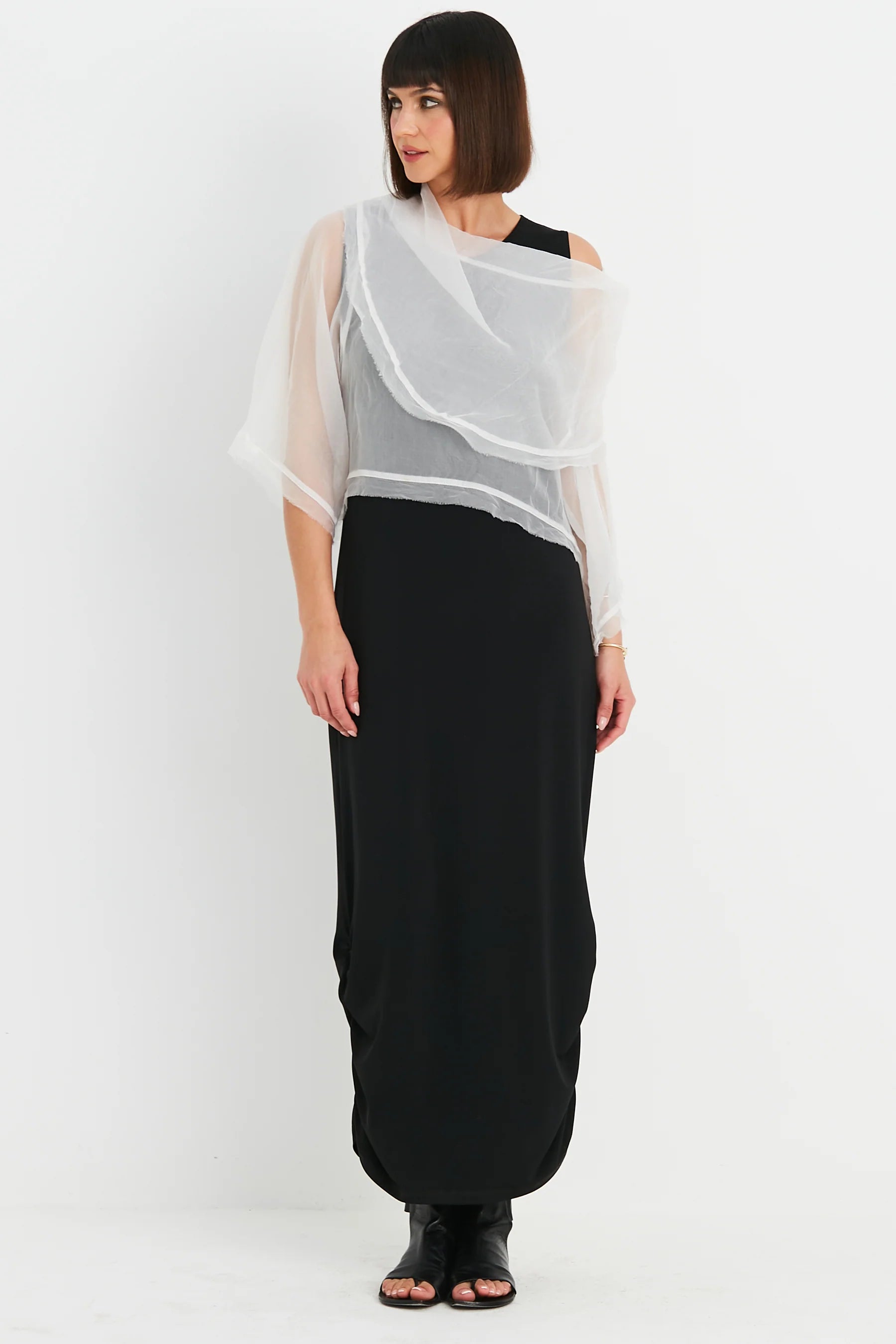 Timeless “Jackie O” silk organza cropped cowl top is the perfect 'dress up, go out' item to covet. Features kimono-like sleeves. Lends itself to flirty sophistication. A great addition to any wardrobe.