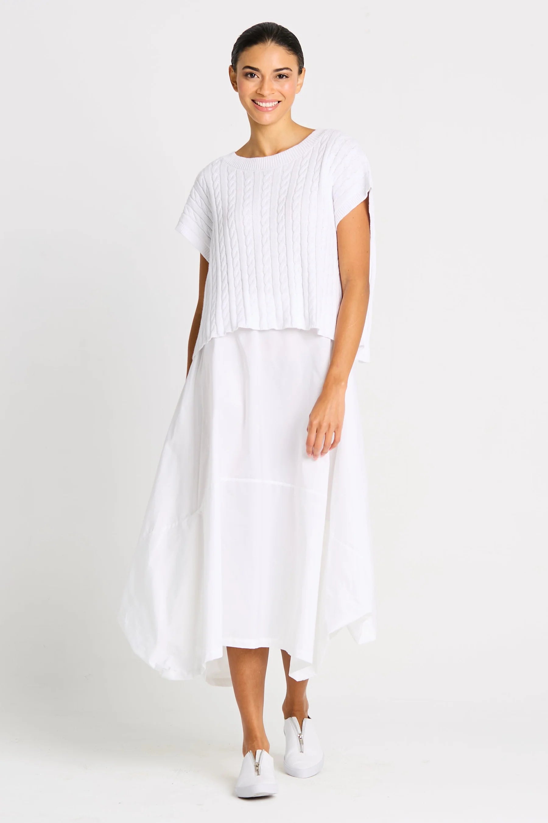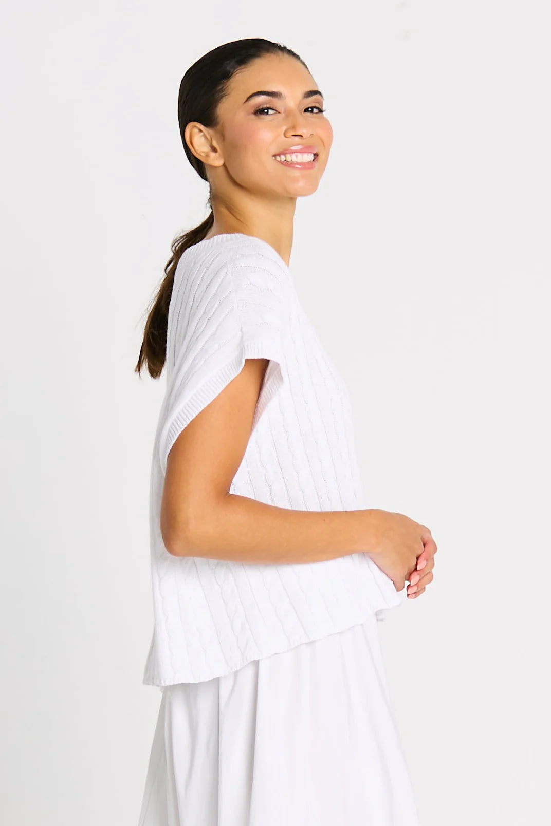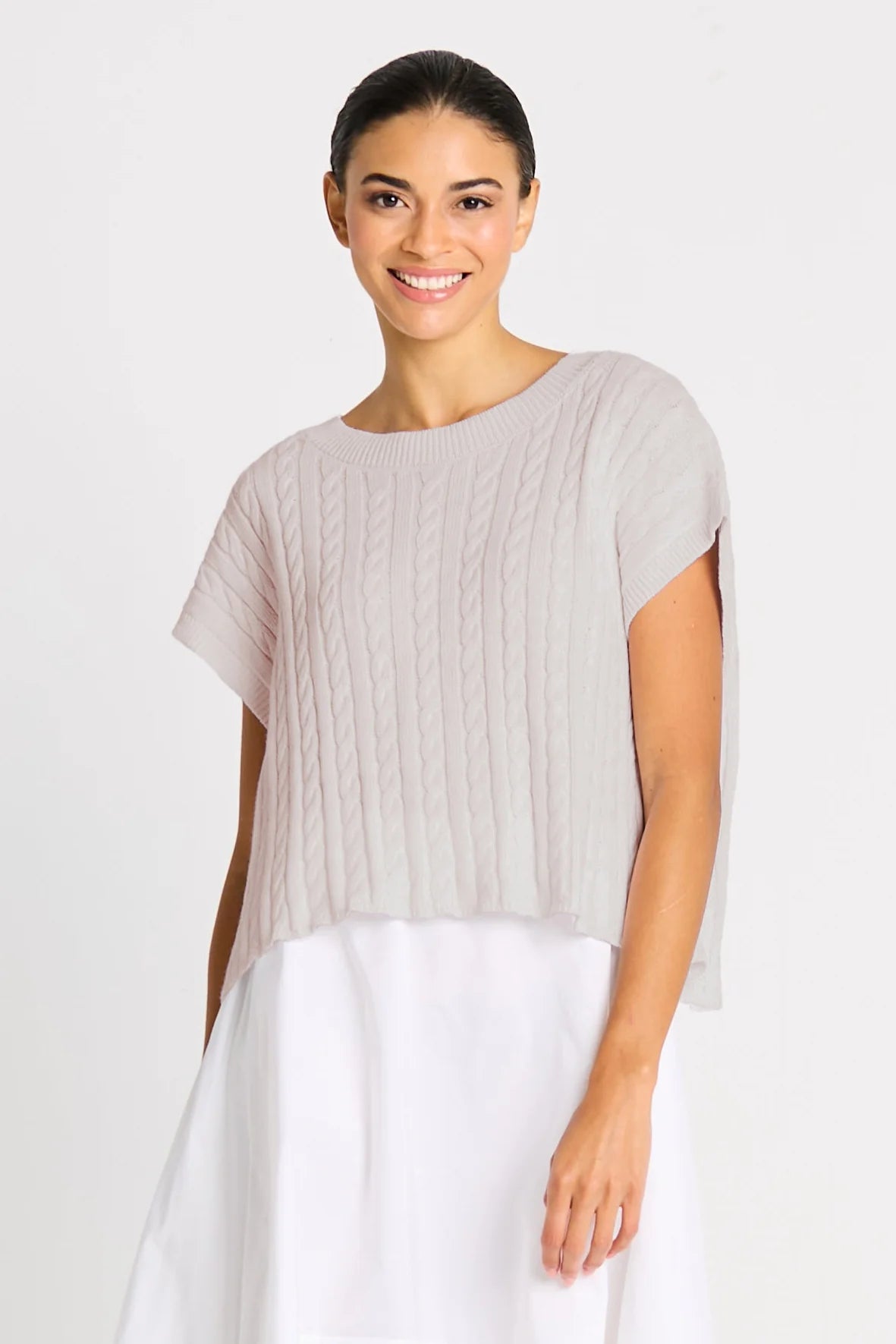 Clean, modern, and effortlessly refined, the Bateau Cable Knit Top offers a fresh take on classic knit texture. Crafted from soft Pima cotton knit, this sweater features a subtle cable knit pattern integrated directly into the fabric for understated dimension. Designed with a simple, loose-fitting body, crewneck, and cap sleeves, it delivers an easy silhouette with a polished finish.